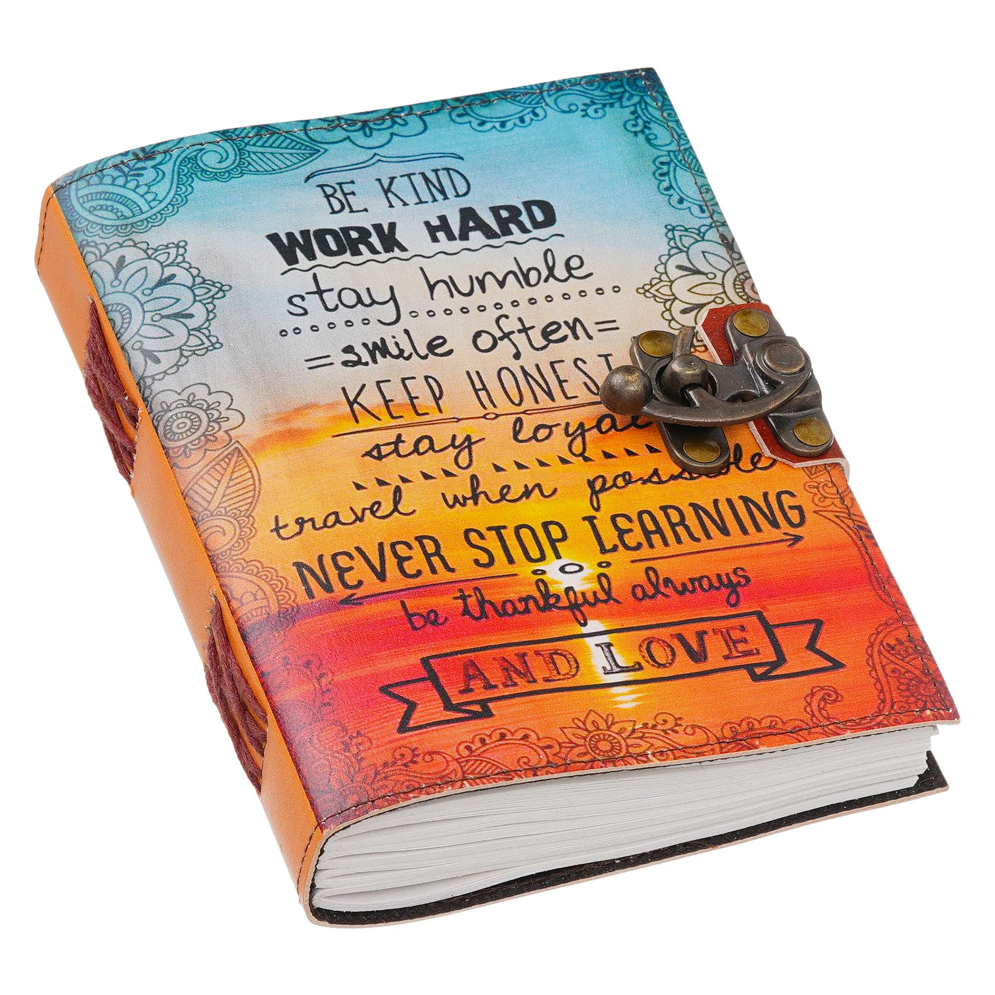 vintage handmade leather journal. Crafted with genuine leather, it radiates authenticity and charm, perfect for those who appreciate classic craftsmanship. The premium antique lock closure adds a touch of elegance and security, ensuring your thoughts and memories are safeguarded within its pages. Inside, you’ll discover 200 White handmade pages, providing ample space for your musings, sketches, and stories to unfold. Whether it’s for journaling, sketching, or planning, this versatile journal is a timeless companion for your creative endeavors. Treat yourself or a loved one to this exquisite piece, a celebration of tradition and creativity