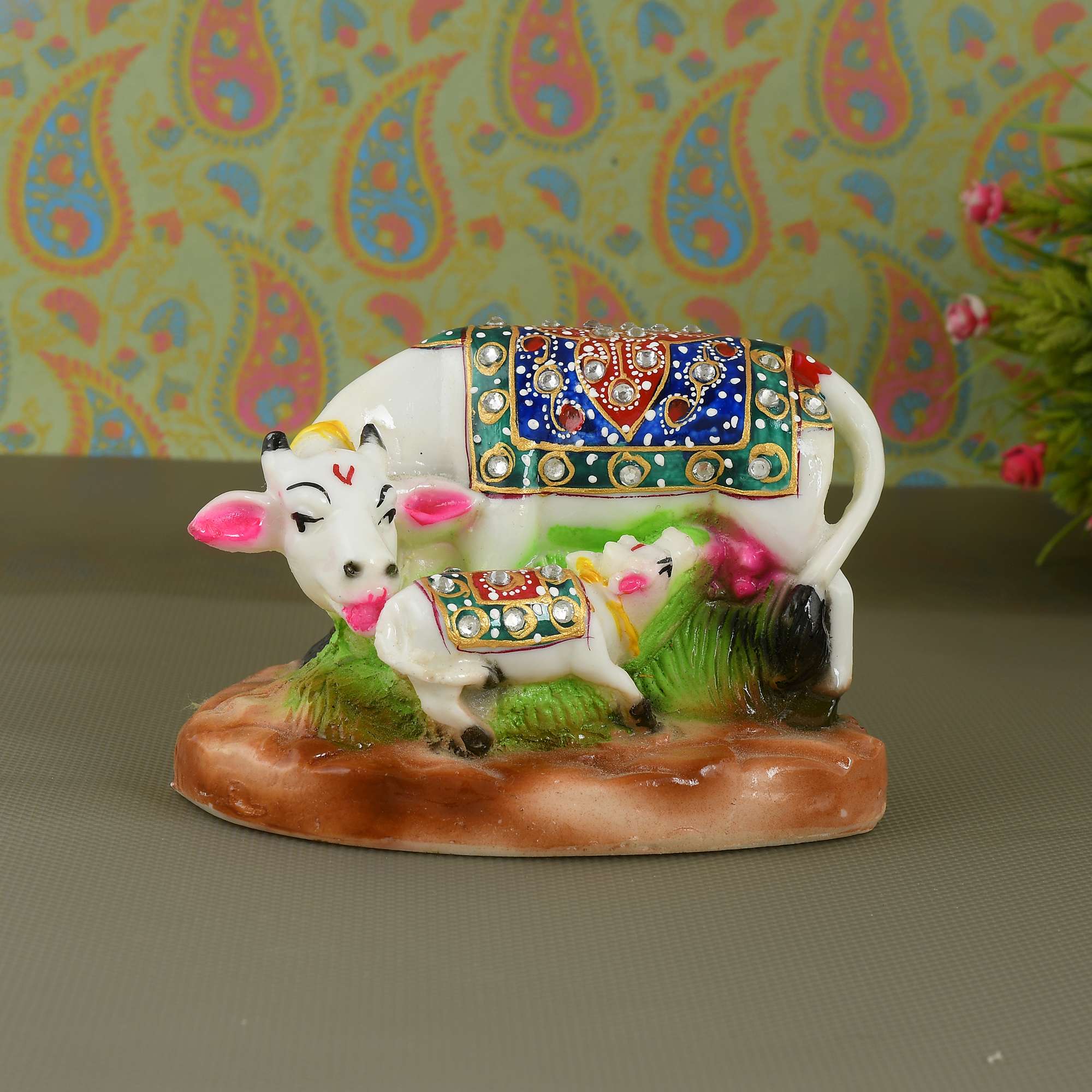 This beautiful white marble statue depicts a Kamdhenu cow and her calf. The Kamdhenu is a sacred cow in Hinduism, believed to be the source of all desires and capable of granting wishes. This statue is hand-carved from marble and would be a perfect addition to your home or office, or as a gift for someone special.